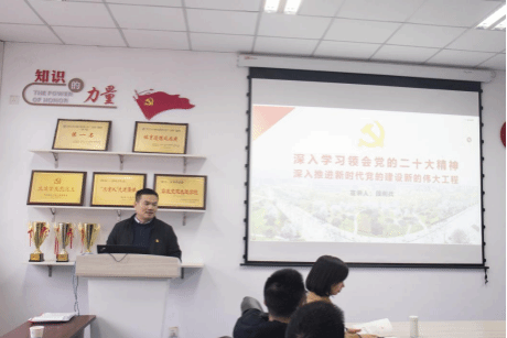 段利兵以“深入学习领会党的二十大精神,深入推进新时代党的建设新的伟大工程”为主题,从深入学习领会“党的二十大的重要意义”“党的二十大的主题”“过去五年的工作和新时代十年伟大变革的重大意义”等八个部分深入浅出地介绍了党的二十大精神概况,并结合公司党的建设工作实际,围绕上级关于高等学校基层党组织建设的要求,重点对全面加强公司党的建设进行了深刻阐述。他强调,学院基层党委(组织)要深入贯彻落实新时代党的建设总要求,切实履行全面从严治党主体责任,从加强党支部的政治建设、思想建设、组织建设、作风建设、纪律建设等方面做好新时代党建工作,特别是要强化基层党委政治功能和组织功能,切实加强党支部建设、党员活动阵地建设,着力加强基层党支部特色挖掘,形成党建品牌,以高质量党建引领学院高质量发展,在助力学校为党育人、为国育才的新征程中贡献更大力量。